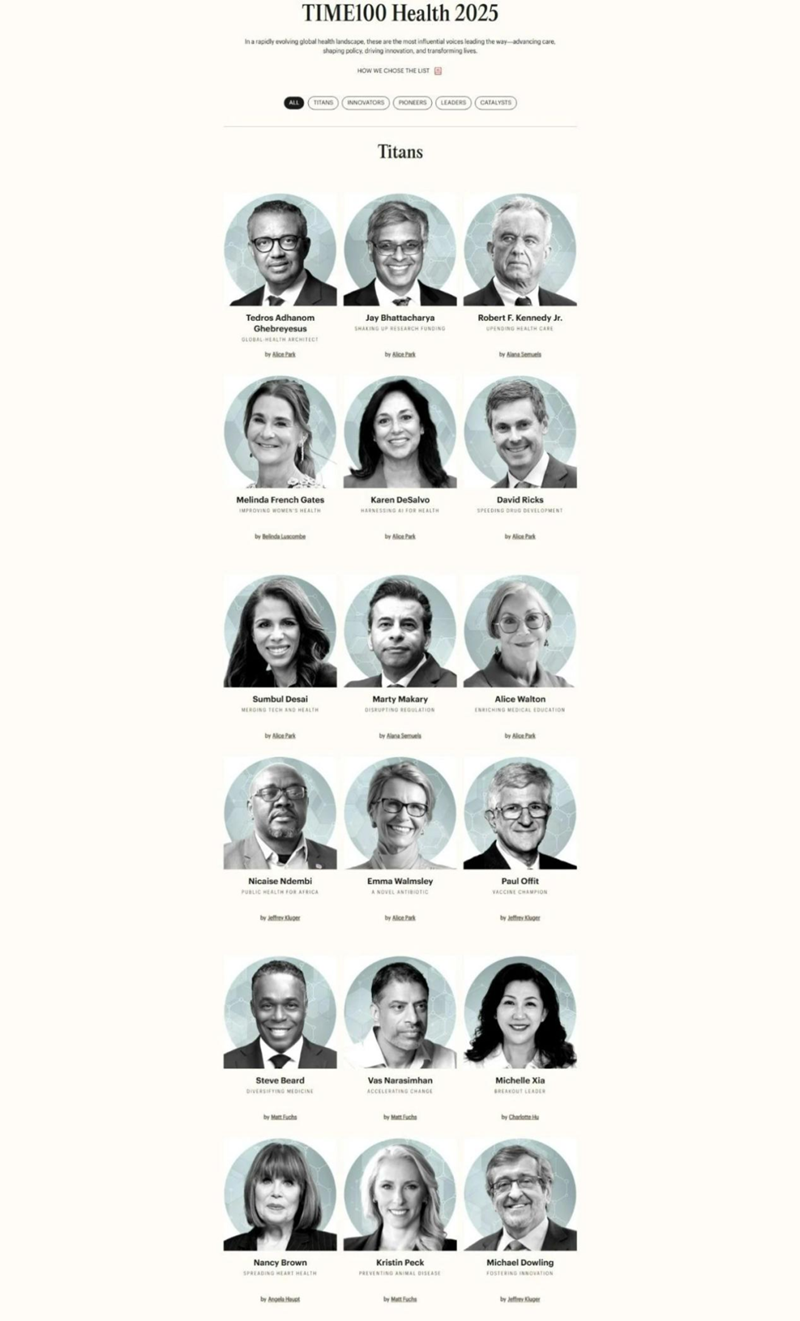 TIME100 HEALTH 2025由《時代雜志》資深編輯團隊與全球醫(yī)學專家歷時數(shù)月調(diào)研產(chǎn)生,入選者均為推動世界健康事業(yè)發(fā)展的變革型人物,包括政界、學界、產(chǎn)業(yè)界和投資界的領(lǐng)袖,彰顯了其對行業(yè)乃至全球公共衛(wèi)生格局的深遠影響力。入選者包括美國衛(wèi)生與公眾服務(wù)部新任部長、美國FDA 新任局長、GSK CEO、諾華CEO、禮來CEO、斯隆—凱特林癌癥研究中心主任、英國凱特王妃等。