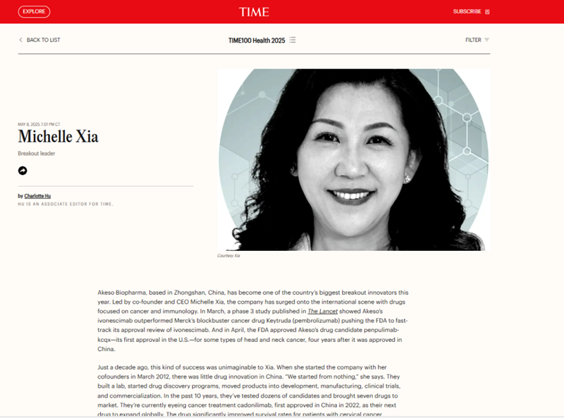 5月8日,美國《時代》(TIME)雜志公布了2025年全球“醫(yī)療健康最具影響力100位人物”(TIME100 Most Influential People in Health of 2025)榜單。健康基地園區(qū)企業(yè)康方生物創(chuàng)始人、董事長、總裁兼首席執(zhí)行官夏瑜博士憑借其對全球生命科學領(lǐng)域發(fā)展的貢獻,及其所領(lǐng)導的康方生物在生物藥物創(chuàng)新開發(fā)領(lǐng)域取得的卓越成就入選該榜單,并被選入此次榜單的“Titans”(泰坦)系列人物。